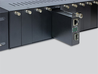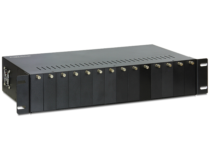 This Delock rackmount chassis can supply up to 14 media converters with power. The media converters are fitted with a mounting rail and can then be inserted into the housing. The redundant power supply provides a reliable power source.