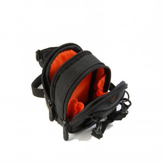 The smallest pouch of this fashionable collection, the RONDO 10, takes the mini digital camera and combines function and protection. The shoulder strap and or belt loop will provide you with the comfort you need. The zippered front pocket provides room for your accessories and cell phone
