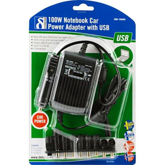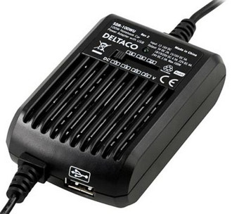 Deltaco SDR-100WU. Charger type: Auto, Charger compatibility: Notebook, Power source type: Cigar lighter. Colour of product: Black. Input voltage: 15 - 24. Dimensions (WxDxH): 59 x 93 x 30 mm