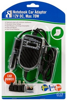 Deltaco SDR-70W. Charger type: Auto, Charger compatibility: Notebook, Power source type: Cigar lighter. Colour of product: Black. Input voltage: 11 - 14. Dimensions (WxDxH): 55 x 90 x 25 mm, Package dimensions (WxDxH): 170 x 35 x 270 mm