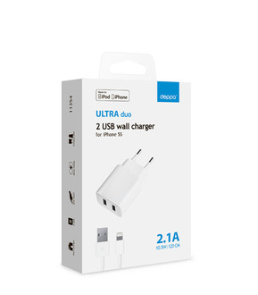 Deppa 11354. Charger type: Indoor, Charger compatibility: MP3, Smartphone, Tablet, Power source type: AC. Colour of product: White, Cable length: 1.2 m. Input voltage: 110 - 240, Output voltage: 5 V, Input current: 0.15. Package height: 14.5 cm, Package width: 10 cm, Package depth: 3.3 cm. Cables included: USB