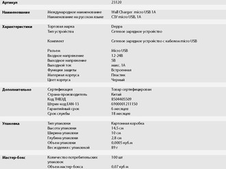 Deppa 23120. Charger type: Indoor, Charger compatibility: Mobile phone, Universal, Power source type: AC. Colour of product: Black. Input voltage: 110 - 240, Output voltage: 5 V, AC adapter output current: 1 A. Package height: 145 mm, Package width: 100 mm, Package depth: 28 mm