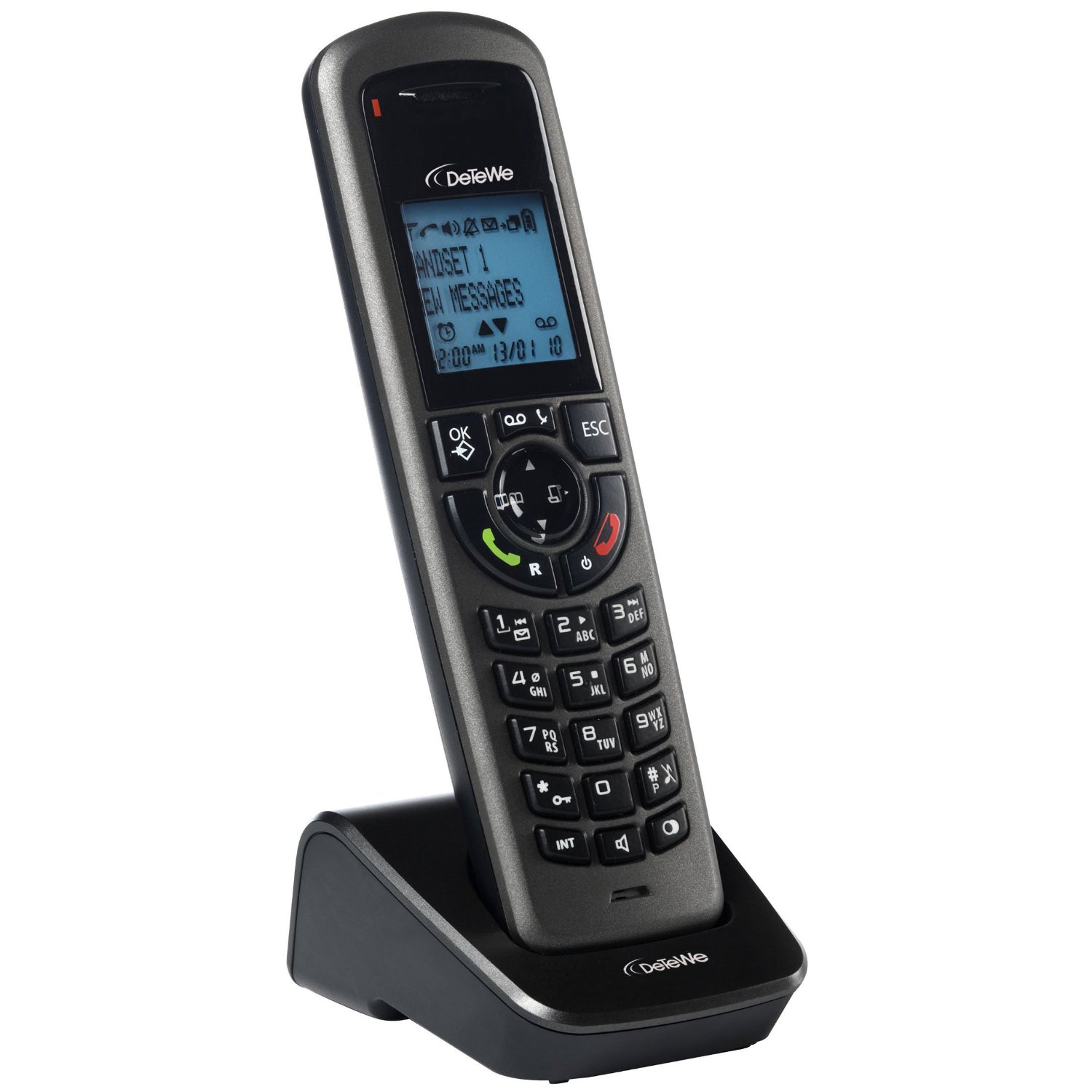 DeTeWe BeeTel 900c. Type: DECT telephone. Colour of product: Black. Phonebook capacity: 200 entries. Display: LCD, Display number of lines: 5 lines, Backlight colour: Blue. Talk time: 10 h, Standby time: 168 h, Battery technology: Nickel-Metal Hydride (NiMH)
