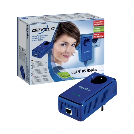With the innovative dLAN® 85 HSplus product, devolo is expanding its successful high-speed HomePlug adapter line for easy-to-install home networks. The dLAN® 85 HSplus is equipped with an integrated electrical socket, making it perfect for use in rooms that have a limited number of wall sockets, because it makes sure that no power outlet goes to waste. The clever design is not the only reason the newest member was able to join the high-speed product line: The integrated mains filter considerably improves the quality of data transmission.