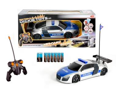 The 28 cm RC Highway Patrol is equipped with a dual-channel wireless RC handset, adjustable steering alignment and full driving functions. The Highway Patrol also boasts working front and rear lights, as well as realistic flashing lights and siren, which can be switched on and off during use. The maximum speed is 8 km/h. The 1:16 scale vehicle operates on a 27 MHz frequency. Batteries included for the transmitter (1x 9V 6R61) and the vehicle (5x 1.5V LR6). The playing time is approx. 120 minutes; recommended for children from age 6