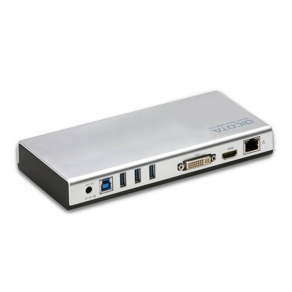 The five USB ports allow you to connect multiple peripheral devices to your notebook, such as a keyboard, mouse, printer or external hard disk drive. Enjoy the benefits of USB 3.0 SuperSpeed technology for top data transfer speeds. The universal docking station offers two types of graphics output (HDMI & DVI-I) for monitors and televisions. The integrated graphics chip set supports full HD+ resolution and does not impair the performance of your laptop/tablet thanks the premium-quality graphics controller. The whole package is rounded off with a powerful Gigabit Ethernet port as well as audio input and output. The DICOTA Smart Dock includes an integrated dual card reader for SD and micro-SD cards. The Smart Dock can easily be turned into an easy backup solution by using your backup software of choice together with an external data carrier. Use automated backups every time you connect your device to avoid losing any important data – protect your world.