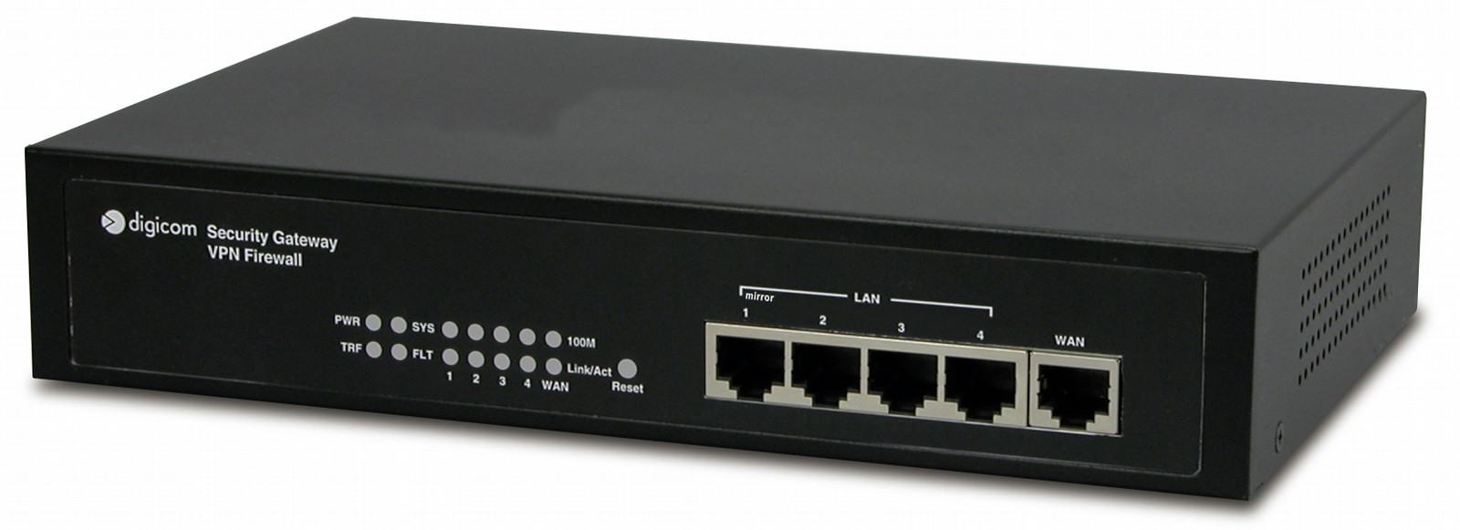 Digicom FW41IP5-U01. Networking standards: IEEE 802.3, IEEE 802.3u. Connectivity technology: Wired, WAN connection: Ethernet (RJ-45). Supported network protocols: IP, TCP, ARP, UDP, ICMP, NAT, NAT, DHCP, SNTP, TELNET, HTTP, TFTP, PPP, SNMP, PPPoE, PAP, CHAP, SYSL, Routing protocols: IP, RIP-1, RIP-2. Security algorithms: 3DES, DES, Firewall security: NAT, Content filtering: URL, IP / MAC. Cables included: AC