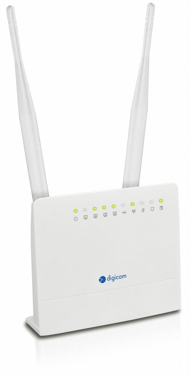 Digicom RAW300L-A05. Wi-Fi band: Single-band (2.4 GHz), Top Wi-Fi standard: IEEE 802.11n, WLAN data transfer rate (max): 300 Mbit/s. Ethernet LAN interface type: Fast Ethernet, Ethernet LAN data rates: 10,100 Mbit/s, Cabling technology: 10/100Base-T(X). Networking standards: IEEE 802.11b,IEEE 802.11g,IEEE 802.11n,IEEE 802.1p, Routing protocols: RIP-1,RIP-2, Management protocols: SNMP, UPnP. Supported network protocols: PPPoA, PPPoE, RFC1483, IPoA, IPoE. Antenna type: External