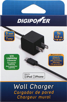 Digipower home charger for iPhone & iPod. Provides 1 amp (5 Watt) of power with tethered Lightning connector.