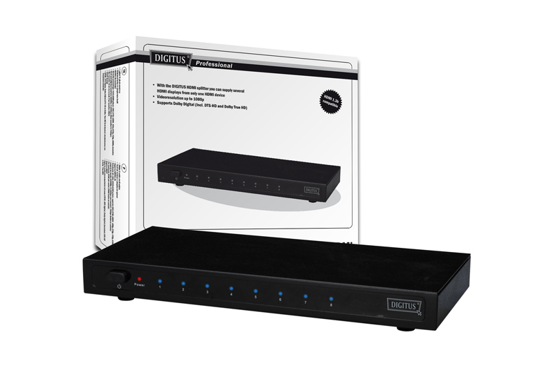 Digitus 8-Port HDMI Splitter. Video port type: HDMI, Connector(s): HDMI1.3b. Maximum resolution: 1920 x 1080 pixels, Bandwidth: 225 MHz. Colour of product: Black
