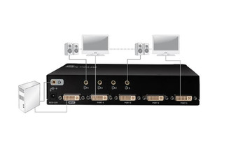 With a DVI video/audio splitter it is possible to display a signal from a DVI video source on several monitors/speakers.