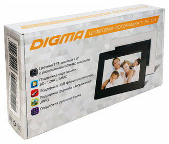 DIGMA PF-731. Display diagonal: 17.8 cm (7"), Display resolution: 800 x 480 pixels, Aspect ratio: 16:9. Image formats supported: JPEG XR. Compatible memory cards: MMC, SD, SDHC. Interface: USB 2.0. Placement supported: Horizontal