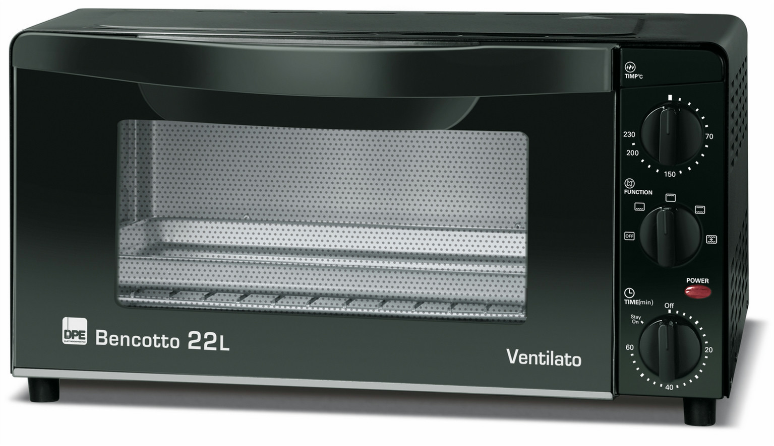 DPE Bencotto 22L. Oven type: Electric oven, Total oven(s) interior capacity: 22 L, Total oven power: 1300 W. Colour of product: Black, Control type: Rotary. Package width: 465 mm, Package depth: 426 mm, Package height: 290 mm
