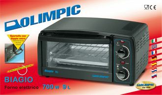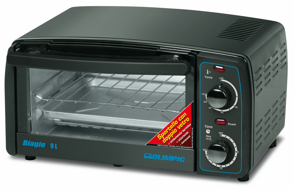 DPE Biagio 9L. Oven type: Electric oven, Total oven(s) interior capacity: 9 L, Total oven power: 700 W. Colour of product: Black, Control type: Rotary. Width: 370 mm, Depth: 270 mm, Height: 190 mm