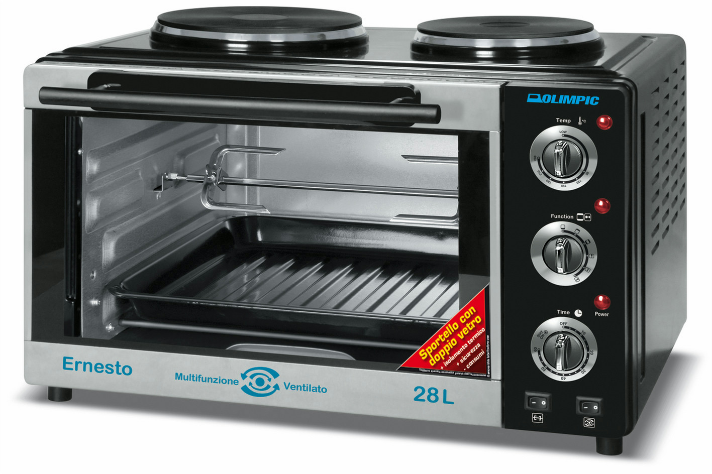 DPE Ernesto 28L. Oven type: Electric oven, Total oven(s) interior capacity: 28 L, Total oven power: 2000 W. Colour of product: Black, Stainless steel, Control type: Rotary. Width: 510 mm, Depth: 420 mm, Height: 340 mm