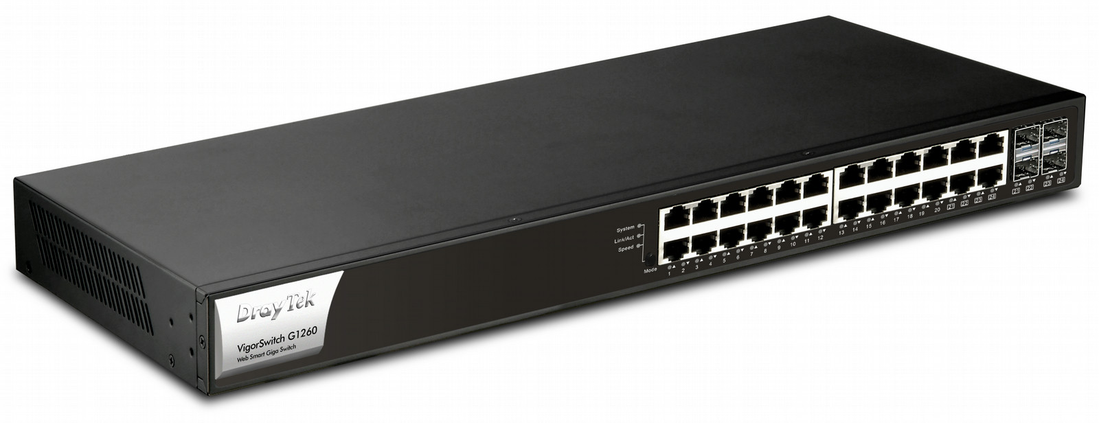 Draytek VigorSwitch G1260. Switch type: Managed network switch. Basic switching RJ-45 Ethernet ports type: Gigabit Ethernet (10/100/1000), Copper ethernet cabling technology: 1000BASE-T,100BASE-TX,10BASE-T. Networking standards: IEEE 802.1D,IEEE 802.1p,IEEE 802.1Q,IEEE 802.1w,IEEE 802.1x,IEEE 802.3,IEEE 802.3ab,IEEE 802.3ad,IEE. Management protocols: SNMP v1, v2c. Colour of product: Black, Case design: Freestanding
