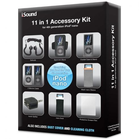 The 11 in 1 Accessory Kit has everything you need for your iPod Nano 4G. Included in this kit is high quality Earbuds to provide clean and clear stereo sound, an Audio Splitter that enables you to share your music with a friend using any standard headphones, a Mesh Sleeve that provides a sturdy but stretchable case with elastic band, the Sport Arm Band: perfect for running or working out. The Sport Armband is made of high quality neoprene construction and Velcro closure that makes it perfect for any size arm.