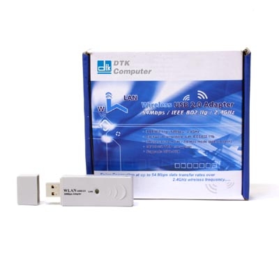 DTK Computer USB WLAN Adapter 54Mbsp. Connectivity technology: Wired, Host interface: USB. Data transfer rate (max): 54 Mbit/s, Supported data transfer rates: 1/2/5.5/6/9/11/12/18/24/36/48/54 Mbps. Colour of product: White. Security algorithms: WPA-PSK. Width: 25 mm, Depth: 77 mm, Height: 10 mm