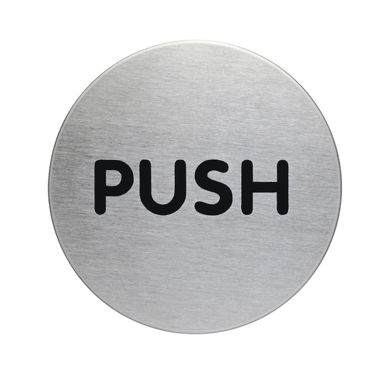 Picto "PUSH" High quality brushed stainless steel pictograms that impress with their simplicity. The 20 different pictograms can be secured to a variety of surfaces using adhesive pads supplied. The symbols/ imprints are scratchproof and hardwearing. Available in size 65mm.