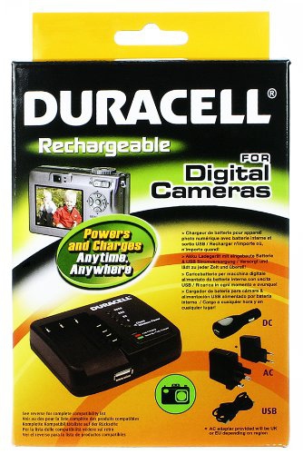 This Duracell camera battery charger with added USB socket (for iPhone, iPod, Blackberry etc) contains an internal rechargeable battery that allows you to charge devices without the need for a mains socket.