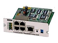 The ConnectUPS X-Slot (ConnectUPS-X) Web/SNMP device allows you to connect your Eaton UPS directly to the Ethernet network and the Internet. This unique solution allows you to conveniently monitor and manage your UPS with a standard Web browser, while simultaneously providing graceful shutdown for multiple computer systems over the network. This model is designed for Eaton for UPSs with X-Slots. This model also integrates a three-port switching hub to support multiple PCs or networking equipment.