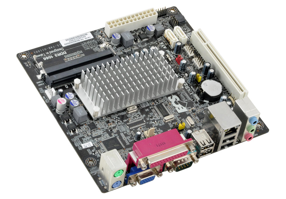 Intel Atom D2550 (1M Cache, 1.86 GHz), 240-pin DDR3 1066/800 MHz, SATA II, Gigabit Ethernet, HDMI, AMI BIOS