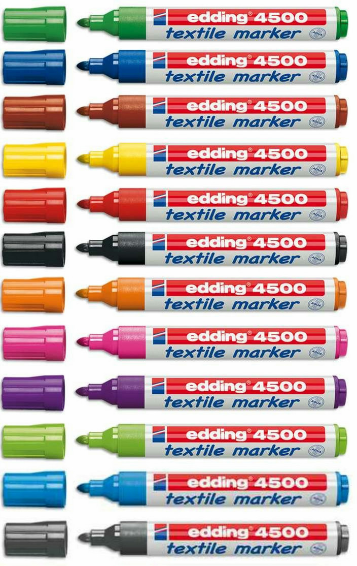 Edding 4500 textile marker, 2-3 mm This textile marker is the ideal edding for labelling and drawing on light coloured textiles. Do you want to add drawings to children’s T-shirts? How about writing a personal message on a babygro? Drawing on decorative cushions or sprucing up an old chair cover? These and many other ideas can very easily become a reality on chemically untreated materials thanks to this textile marker.