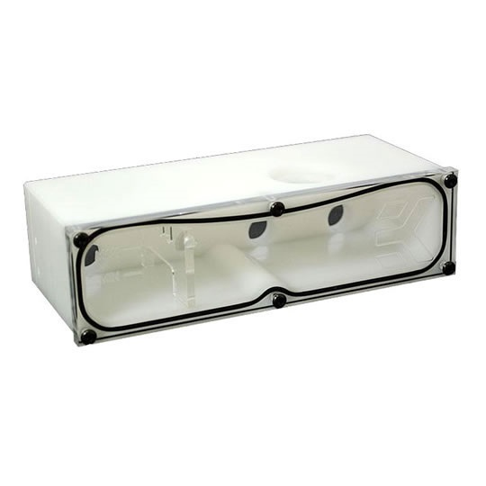 EK-BAY SINGLE Reservoir - White Acetal is a simple, compact yet very efficient water reservoir. Reservoir is made of quality POM Acetal, covered by a 5mm thick acrylic glass. Reservoir features special anti-vortex acrylic insert which effectively prevents air bubbles from re-entering the loop. As a result high flow rates of up to 250L/h (1GPM) are possible with this reservoir. Reservoir features G3/8 threaded filling port, an appropriate plug is enclosed. Reservoir fits in majority of computer chassis and occupies only a single 5.25" drive bay. No boring or sawing is necessary. This reservoir is fully air- and waterproof once closed with the enclosed plugs therefore no water can evaporate.