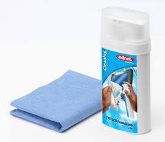 Before cleaning TFT/LCD screens it is advisable to disconnect the power source and ensure that the screen has „cooled down.” Spray the DUO Clean® on to the included cloth and wipe the surface. Repeat the procedure for heavily soiled screens. Do not apply too much pressure to the screen as dust particles can scratch the surface. Do not, under any circumstances, use cleaning solvents, (eg methylated spirits, petrol, acetone or ethylalcohol/ alcohol). Before application please refer to the manufacturer’s cleaning instructions.