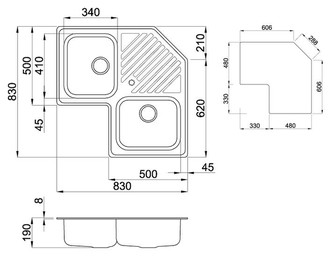 Two-bowl sink with draining area, 830x830mm, Satin SAT