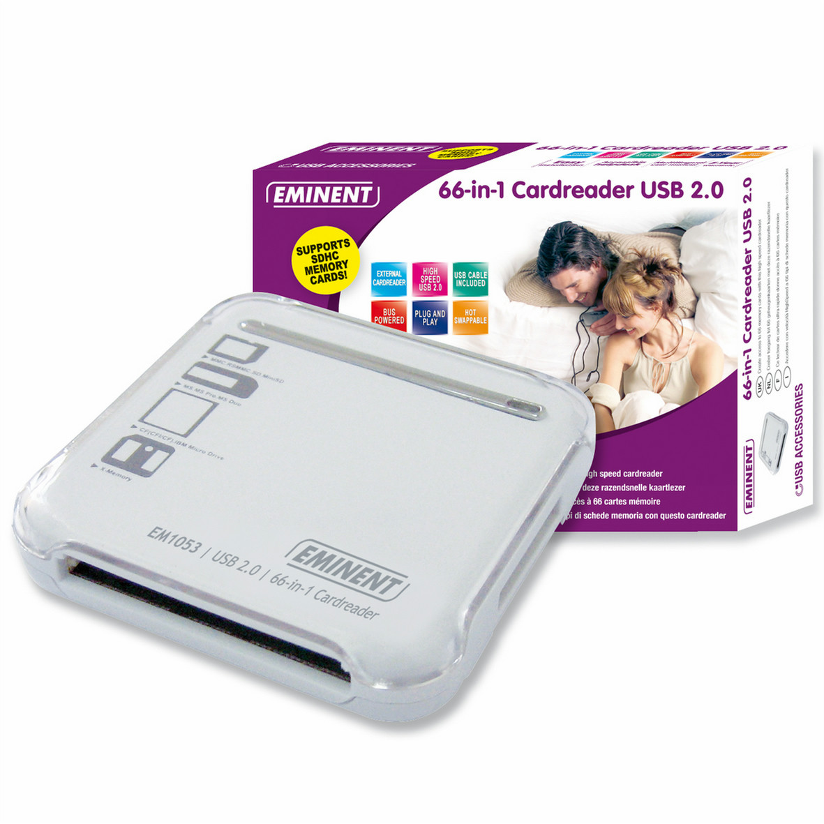 Do you have a digital camera, a PDA or another device which uses a memory card? In that case you can really use the Eminent 66-in-1 Cardreader! With this high quality cardreader you can read and write all popular memory cards. Connect the 66-in-1 Cardreader to a USB port on your computer to access your photos or other data fast and easy. The card reader has a sturdy housing in a modern white design and comes with a USB extension cable. The Eminent 66-in-1 Cardreader allows you to access your updated data anytime!