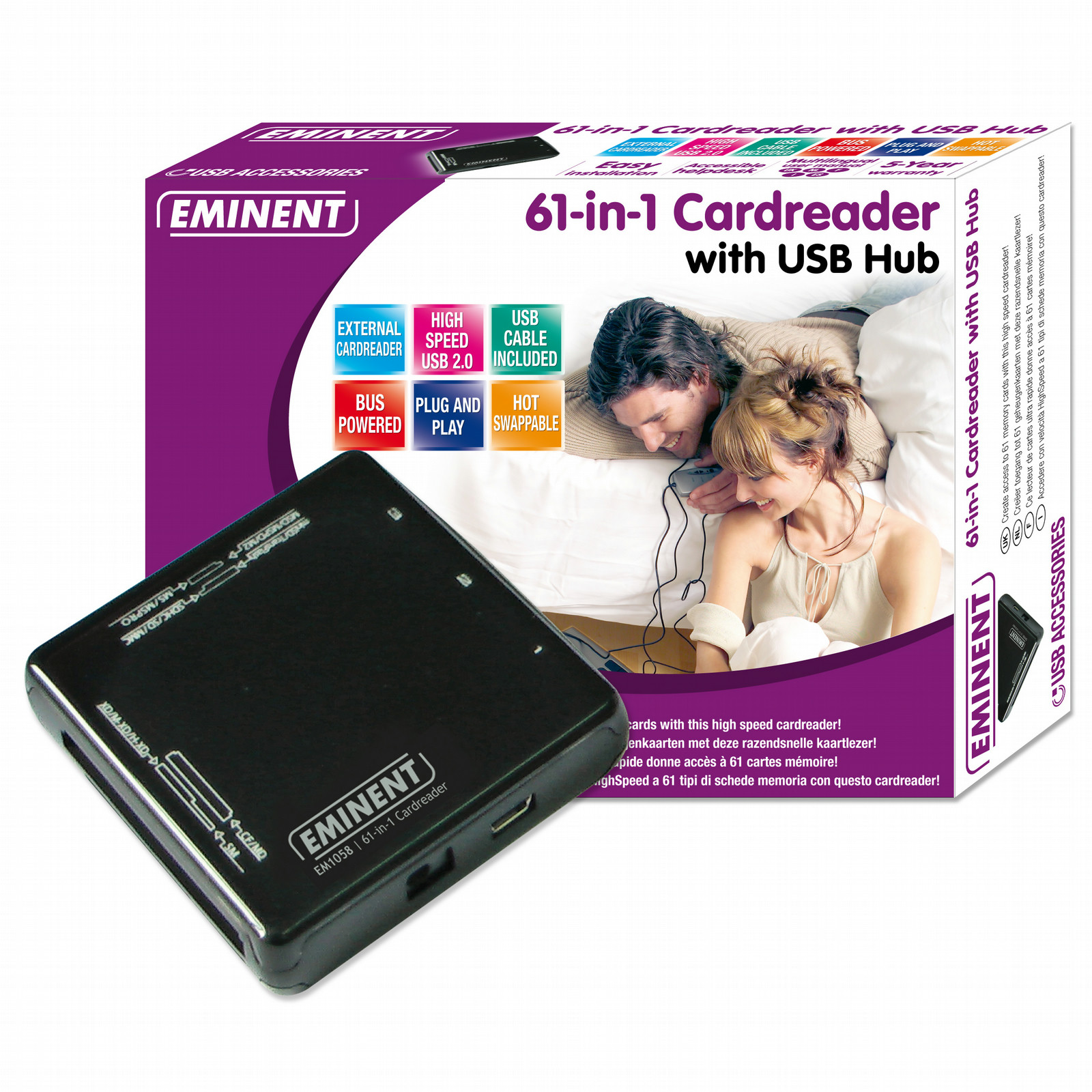 The EM1058 61-in-1 Cardreader also comes with an integrated three ports USB 2.0 hub to easily connect usb devices.