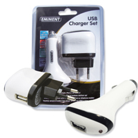 Charge your MP3-player, iPod, PDA or cell phone while your computer is turned off! The Eminent EM1201 USB Charger Set is very useful when you are at home or on the road. This set consists of a 230V charger to use at home and a 12V charger for in your car. Thanks to the standard USB port, you can charge almost any USB device. Simply plug the charger into the wall-outlet or car cigar lighter receptacle, and soon you can enjoy a fully charged MP3 player or cell phone again!