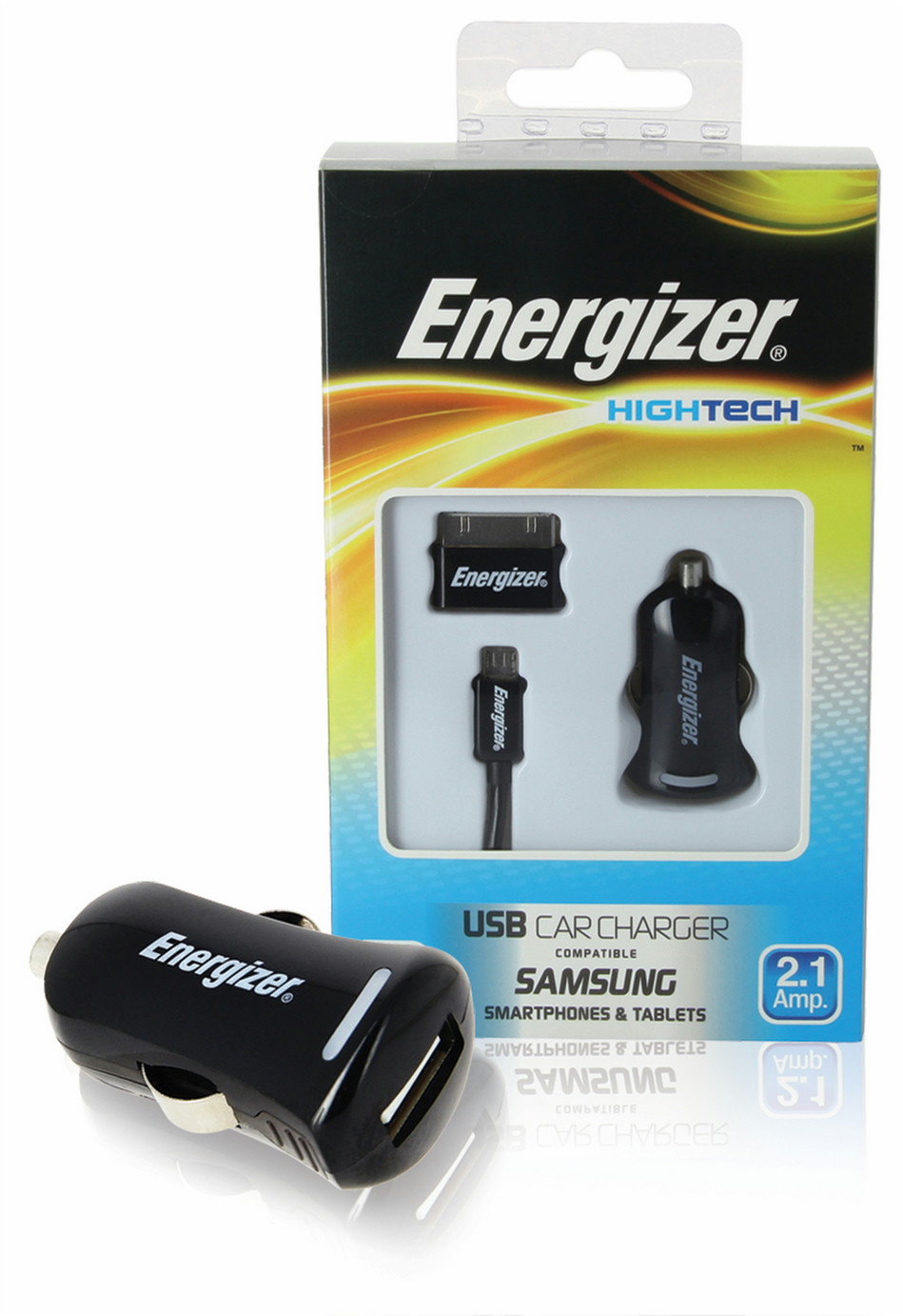 High-tech car charger for Samsung Charge your Samsung compatible devices while you are on the road. With a 10-watt output power (2.1 ampere), the in-car charger supports quick and safe in car charging of your Samsung compatible smartphones or tablets. A USB cable also supports data synchronisation of compatible Samsung devices. ● Supports sync and charge for both Micro USB and Galaxy Tab