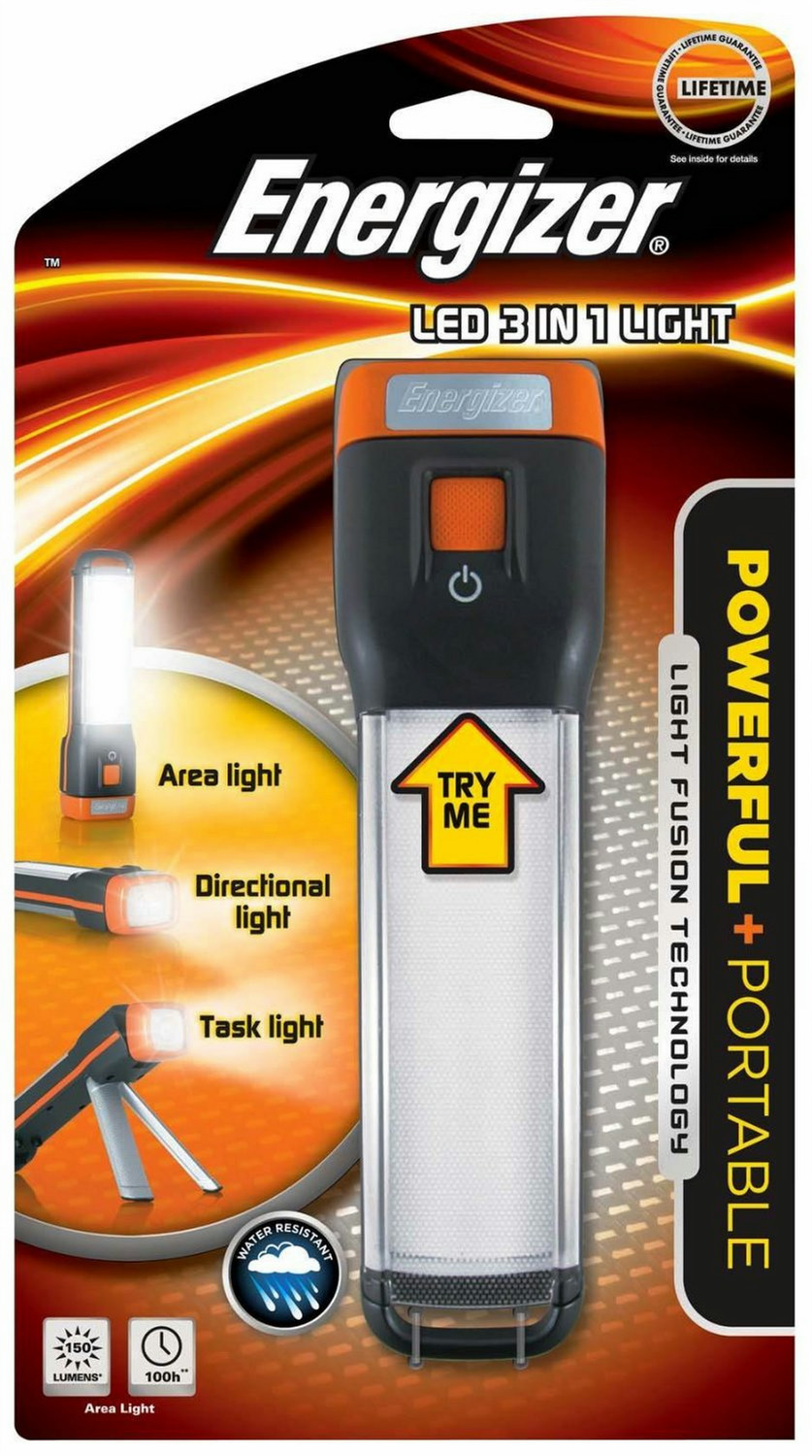 Our new LED lights with Light Fusion Technology deliver vibrant, uniform light for a variety of tasks. The 3 in 1 handheld light is water resistant and backed by a lifetime guarantee. It provides an area light with up to 150 lumens of light output and run time up to 100 hours and a spot light with up to 100 lumens of light output and 10 hours runtime. The sturdy fold-out legs allow for hands free use and the pivoting head directs light where you need it. With smart dimming technology you have full control of brightness and run time. This multifunction light provides the versatility you need to accomplish just about any task.