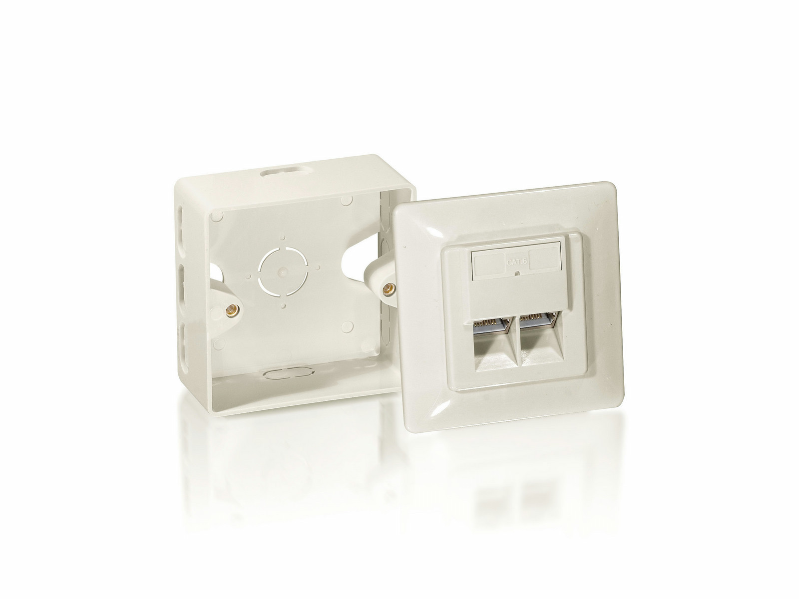The equip® Modular Outlet Set includes a back box and a 2-Port faceplate. The package contains an graphic QIG, offering a total solution for the cable installion.