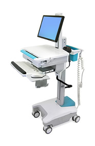 This innovative, ergonomic and easy-to-maneuver healthcare cart features sit-to-stand height adjustment, independent screen positioning and an adjustable negative-tilt keyboard tray.