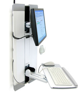 The slide-out, negative tilt keyboard enhances user comfort, while the monitor and keyboard pan capability promote patient-caregiver interaction. A unique cable management system conceals and organizes cords and makes cleaning a snap!