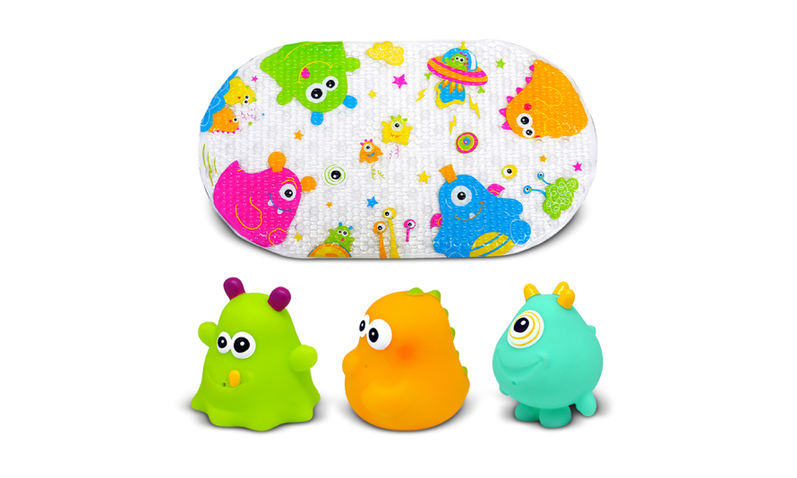 This set Escabbo® from knorr toys guarantees fun in the bath. Bath mat including 3 sweet water squirting animals is a MUST for all bath fans. The little animals are hollow inside and can be easily filled with water – emptying them is then great fun! Dimensions: Mat: 69 x 39 cm; squirting animals: Diameter 6,5 cm