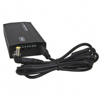 Floating-voltage 100W universal power adapter for portable computers and other devices. 8 voltages to choose: 12V, 15V, 16V, 18.5V, 19.5V, 20V, 24V. Current: 2.5 - 3.5A, 100W. Input Voltage: AC 100 ~ 240V, 50/60Hz/11-14V DC. LED operation indicator device. 9 durable power plugs for over 1000 models of laptops from: Compaq / HP, Sony, Toshiba, Acer, Dell, Fujitsu-Siemens, IBM, NEC and other. Dimensions: 120*62*28mm. Additional USB 5V socket for charging multimedia devices.