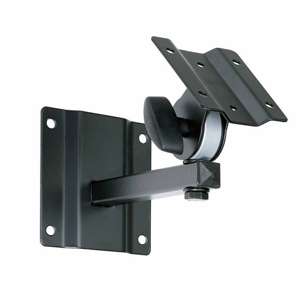Wall mounting speaker bracket with wall plate (120x105x2,5 mm with 4 holes ø 8,5 mm), speaker fixing plate (100x80x2,5 mm) with 6 holes ø 5,5 mm), arm (170 mm) and swivel joint with fixing knob which allows horizontal and vertical adjustment.