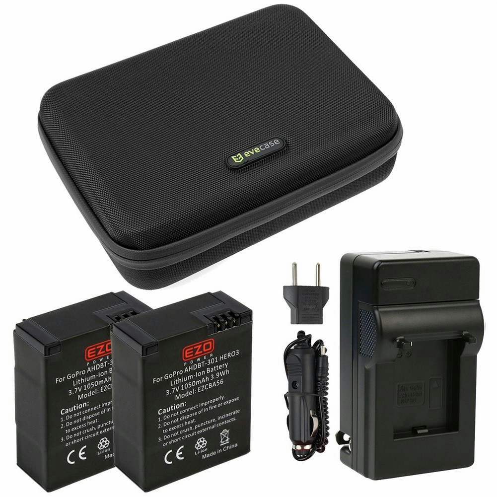 EVA Shockproof Hardshell Organizer Case + Replacement (2-Pack) Batteries + Charger Kit for GoPro HERO 3/3+ Camera