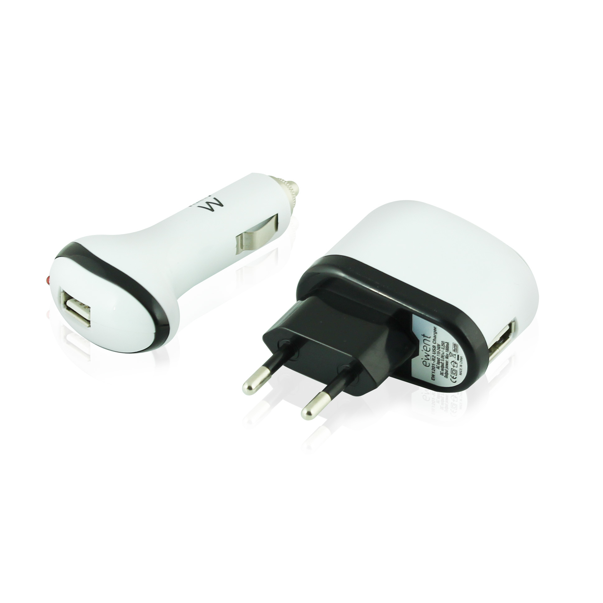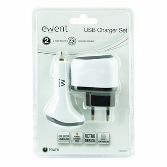 Charge your MP3-player, iPod, PDA or cell phone while your computer is turned off! The Ewent EW1201 USB Charger Set is very useful when you are at home or on the road. This set consists of a 230V charger to use at home and a 12V charger for in your car. Thanks to the standard USB port, you can charge almost any USB device. Simply plug the charger into the wall-outlet or car cigar lighter receptacle, and soon you can enjoy a fully charged MP3 player or cell phone again!