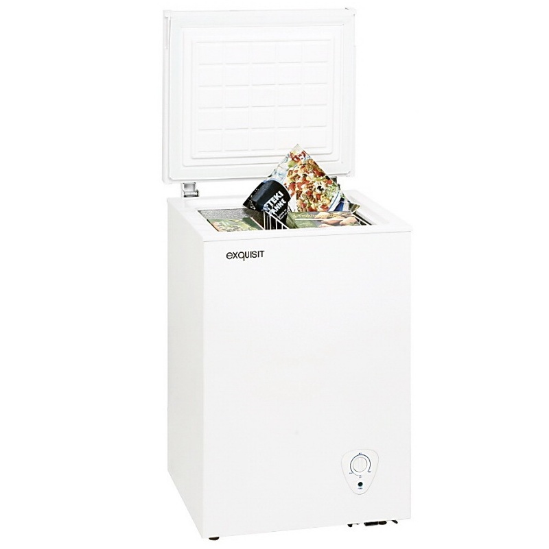 Exquisit GT 111-1. Case design: Freestanding, Type: Chest, Colour of product: White. Freezer net capacity: 100 L, Freezing capacity: 6 kg/24h, Storage time during power failure: 18 h. Energy efficiency class: A+, Connected load: 90 W, Energy usage: 0.46 kWh/24h. Width: 563 mm, Depth: 526 mm, Height: 836 mm