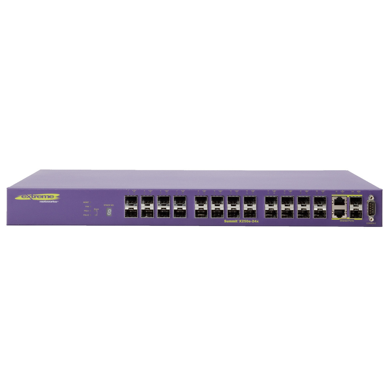 Summit X250e-24x provides high availability and performance with its advanced traffic management capabilities. Summit X250e-24x supports the large- scale rollout of a converged network with devices such as IP telephones, wireless access points and other devices that require power from a LAN connection. Summit X250e-24x supports carrier Ethernet edge deployment with its flexible fiber connectivity options. Summit X250e-24x can support 100BASE-FX, 100BASE-LX10 and 100BASE-BX on its SFP ports depending upon deployment requirements.