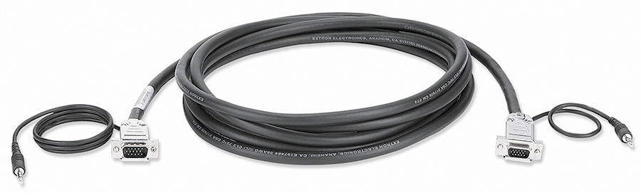 The Extron VGA-A M-M BK cable assemblies are designed for applications that require high performance transmission of VGA video and analog audio signals. All ID bits and +5VDC power on Pin 9 are passed through, provided the computer has a graphics card that complies with VESA DDC standard, version 3. The Extron VGA-A M-M BK utilizes Extron MHRVGA Cable with 15-pin HD male backshell connectors and audio cables with stereo mini plugs. On one side, the audio cable is 24 inches long, and on the other side, the audio cable is 8 inches long.