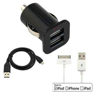 2 USB ports car charger+ Micro USB, 30pin, Black