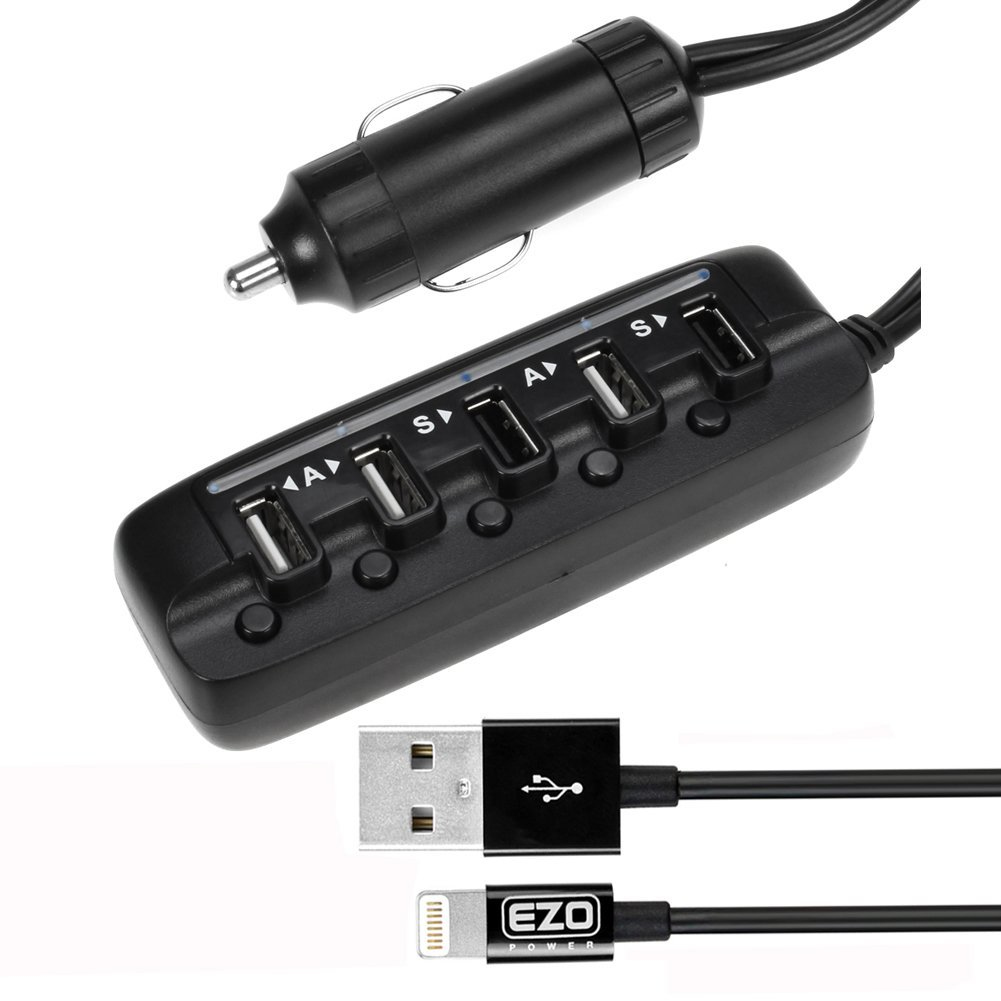 5-Port USB Car Charger Adapter, 8-Pin lightning, Black