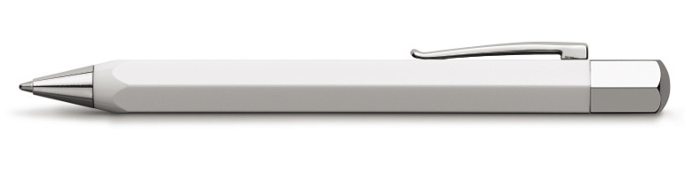 Ondoro White Ballpoint Barrel made of polished precious resin in white. Cap, front pieces and end button made of chrome-plated and polished metal. Spring-loaded metal clip. Large-capacity black refill, B.