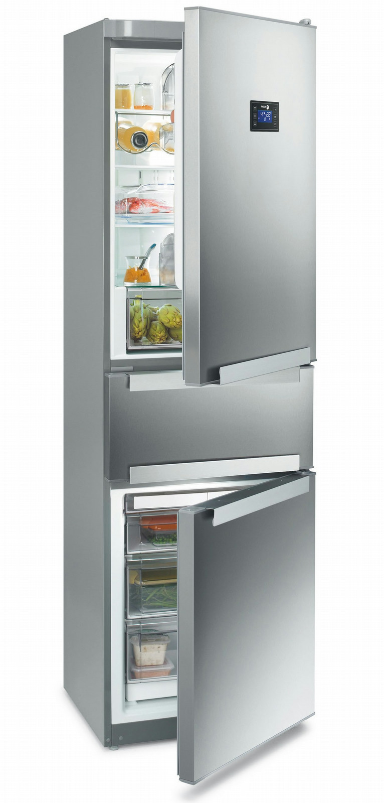 Fagor FFJ8845X. Case design: Freestanding, Colour of product: Stainless steel, Door hinge: Right. Total gross capacity: 340 L, Noise level: 42 dB. Fridge gross capacity: 194 L. Freezer gross capacity: 101 L, Freezing capacity: 10 kg/24h, Storage time during power failure: 13 h. Connected load: 100 W, Annual energy consumption: 300 kWh, Energy usage: 0.822 kWh/24h